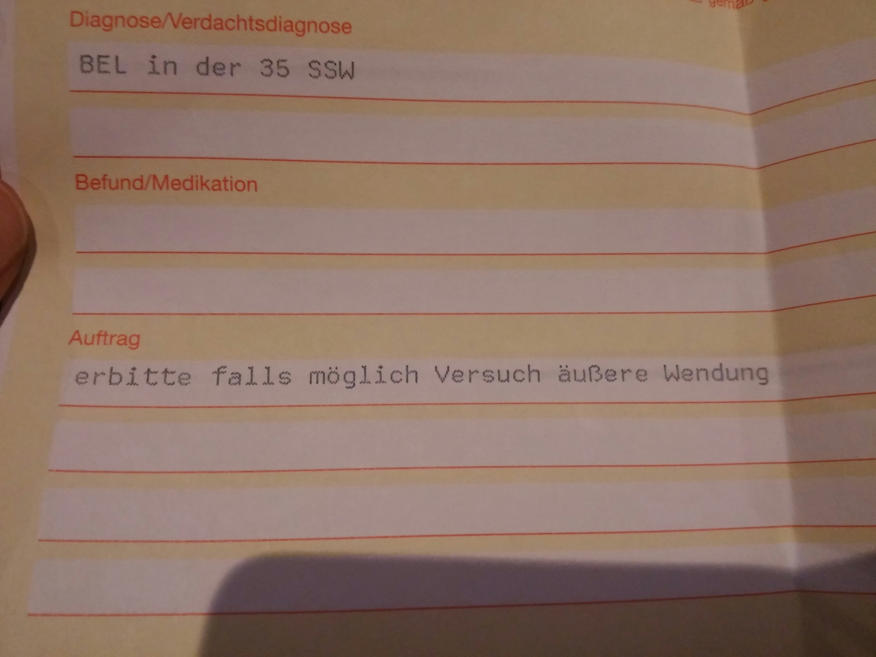 Luck would have it that right before the external version at hospital was to happen, the baby turned. Just by itself. A lot of stress for nothing? Well, while we obviously called off the appointment at the 37 week mark, there is no guarantee the little one will stay the correct way around. As the midwives said, if it still turns now it still has space to do so. Therefore the possibility of the baby being breech again in a few days or close to labor is somewhat high. Fingers crossed it will decide to stay head-down, but just in case…. …it doesn’t present head-down at he onset of labor, more appointments were added to the calendar. Some of them regular check-ups to see if the baby stays in position. Others birth planning sessions at hospital in case it does not. For you see, I was not planning on giving birth on hospital at all. Just like Bubsi, I wanted the little one to be born in a local birth house with only midwife care. The caveat: breech babies cannot be born there. In the entire town, only one hospital has specialists that will allow you to give birth to breech babies spontaneously. So that is where I am now booked in and get regular checks, too. Anywhere else, a c-section is prettt much guaranteed. Needless to say, I really want to avoid surgery. Wish me luck spontaneous labor will work out. Regardless of breech position or not. Whether in hospital or at the midwife-led birth center. How did your babies present just before birth?